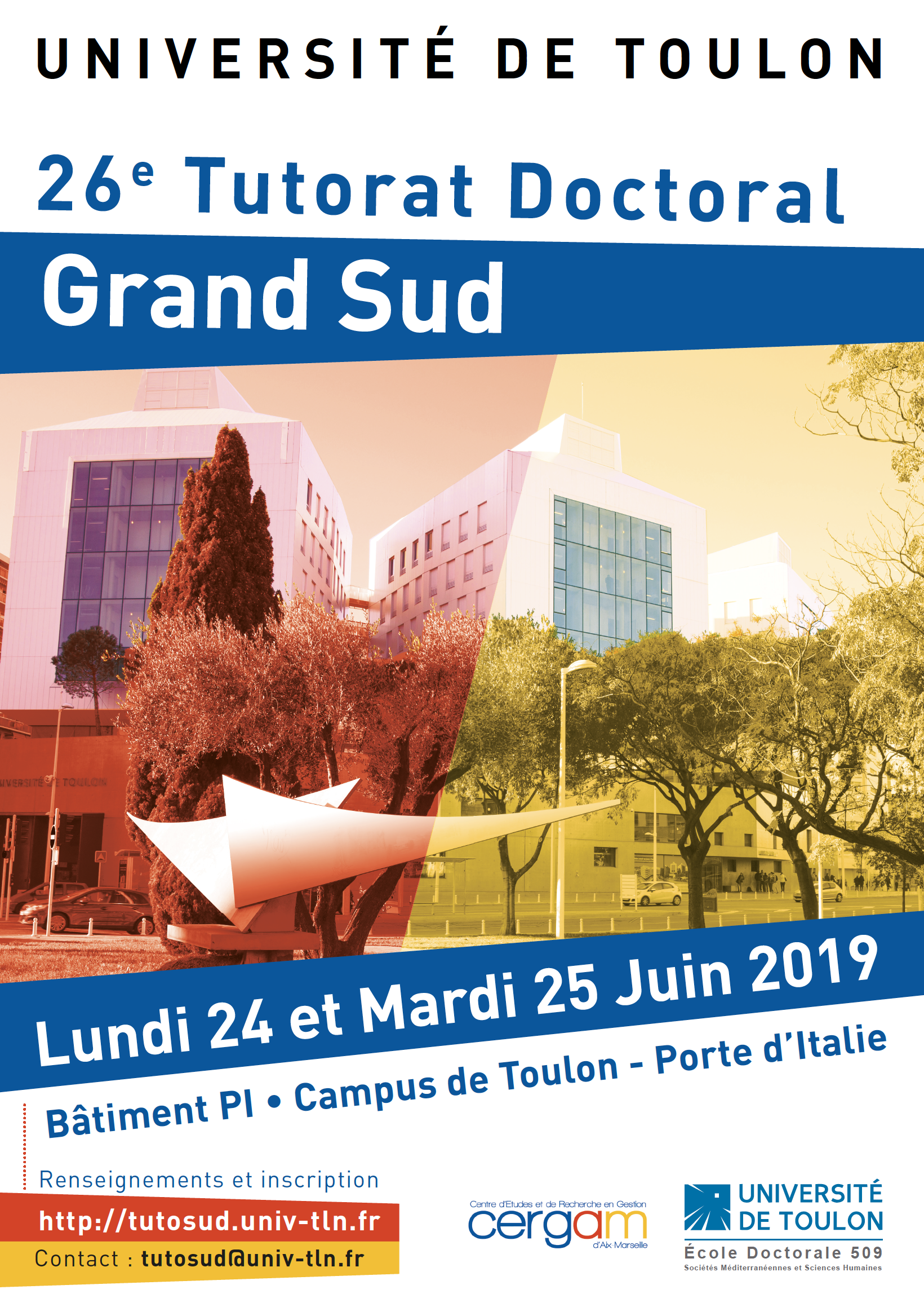Le laboratoire CERGAM de l’Université de Toulon a le plaisir d’organiser cette année le Tutorat Doctoral Grand sud. Ce sera la 26ème édition de cette manifestation qui réunit la grande majorité des laboratoires en Sciences de Gestion de l’Est et du Sud de la France.